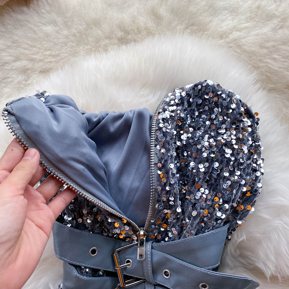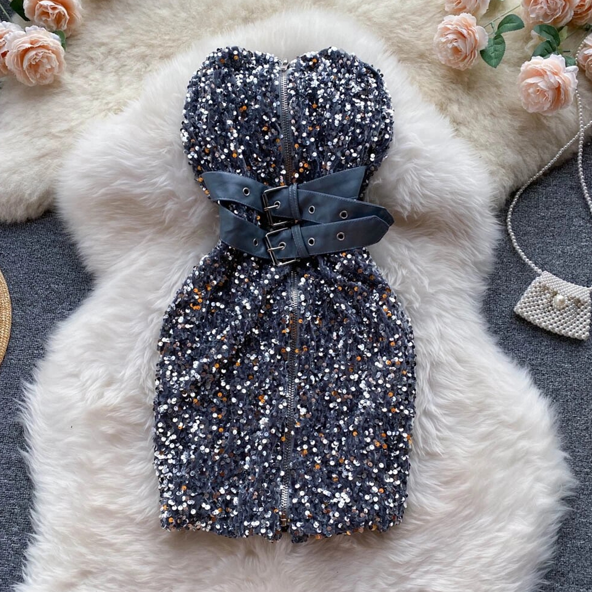 - Quedarás maravillada con este hermoso vestido con lentejuelas y sin tirantes.