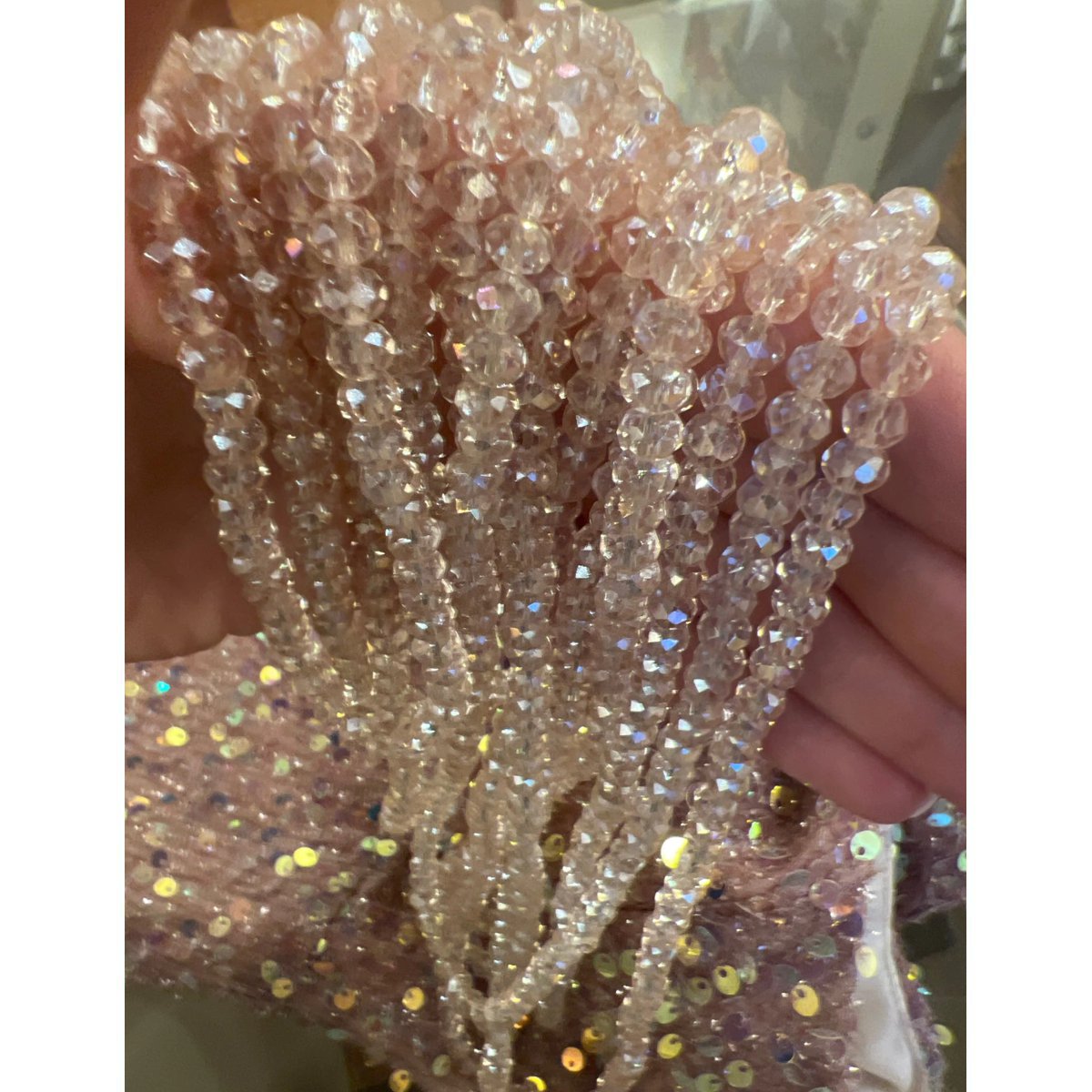 - Con acabado y diseño tipo perlas transparentes doradas.