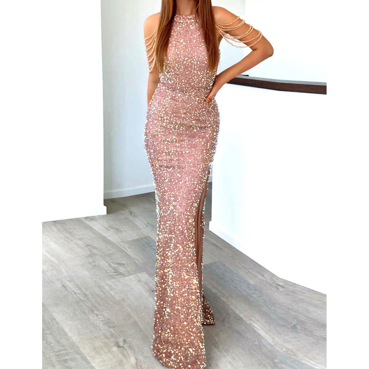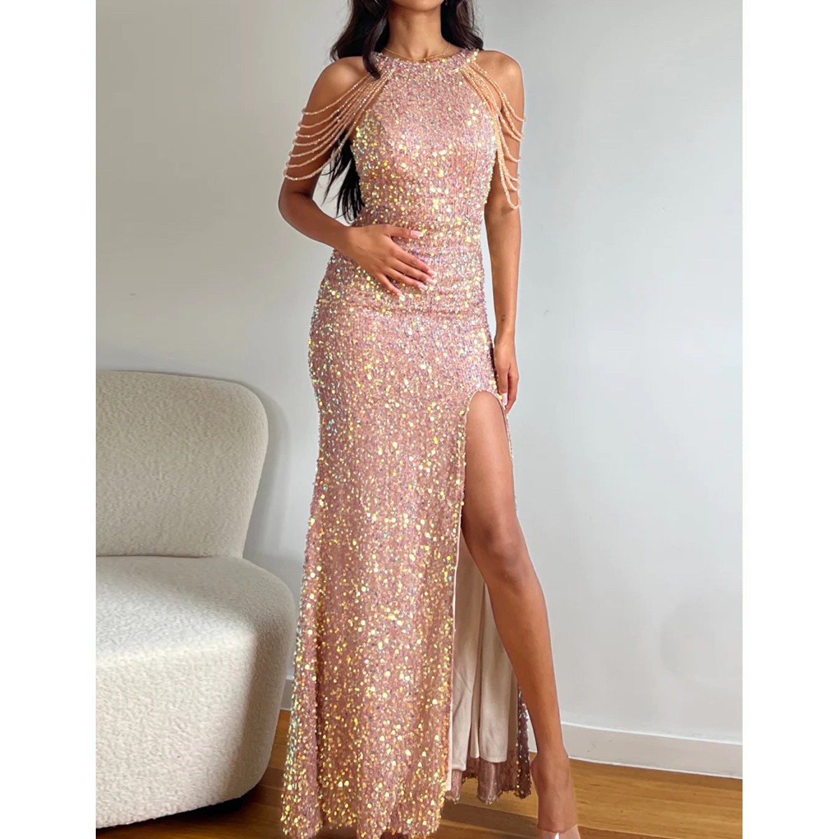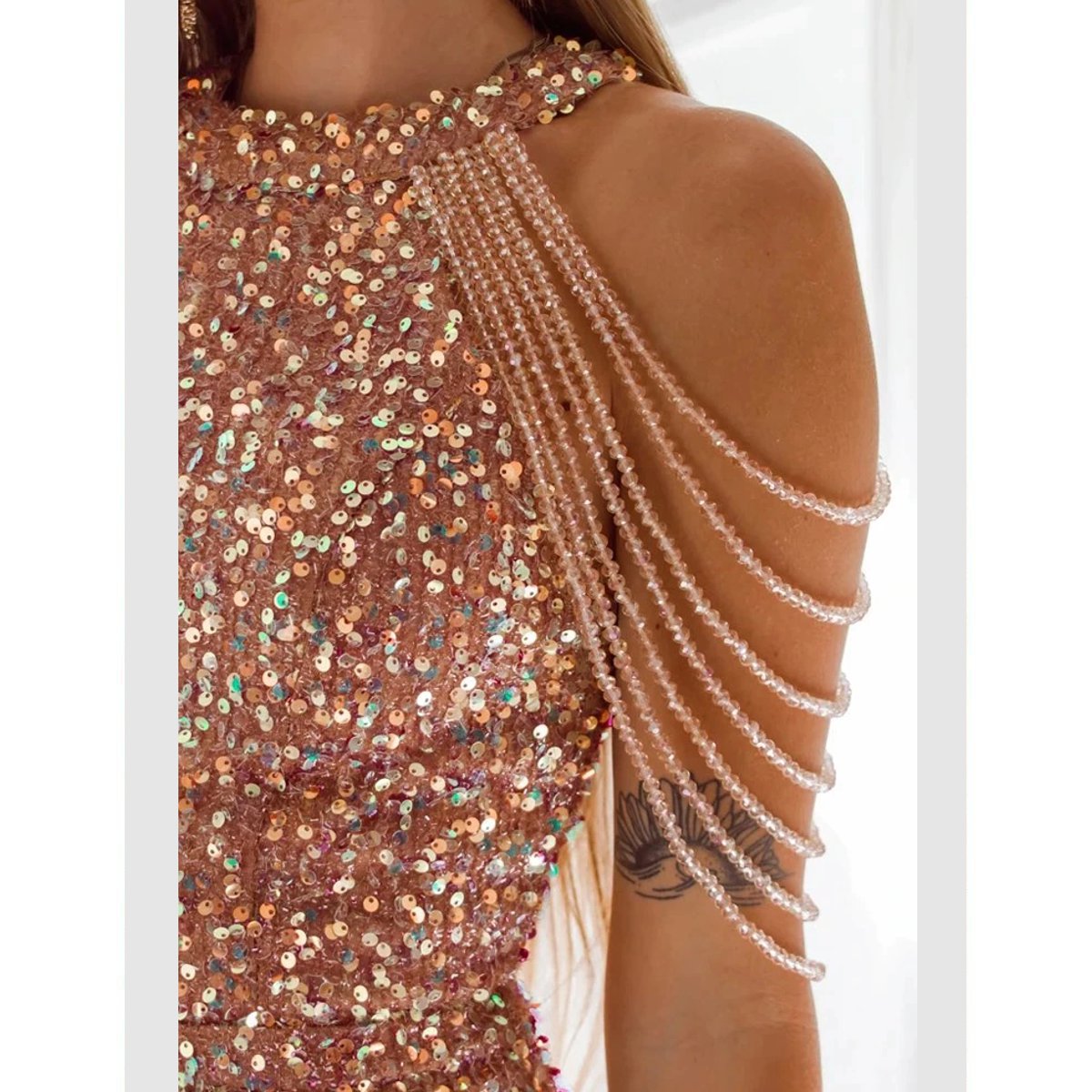 - Hecho de lentejuelas ultra brillantes, con finos tirantes en los hombros.