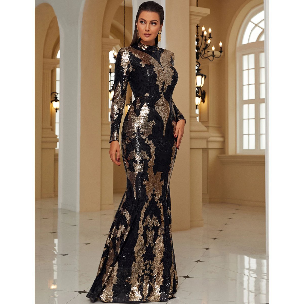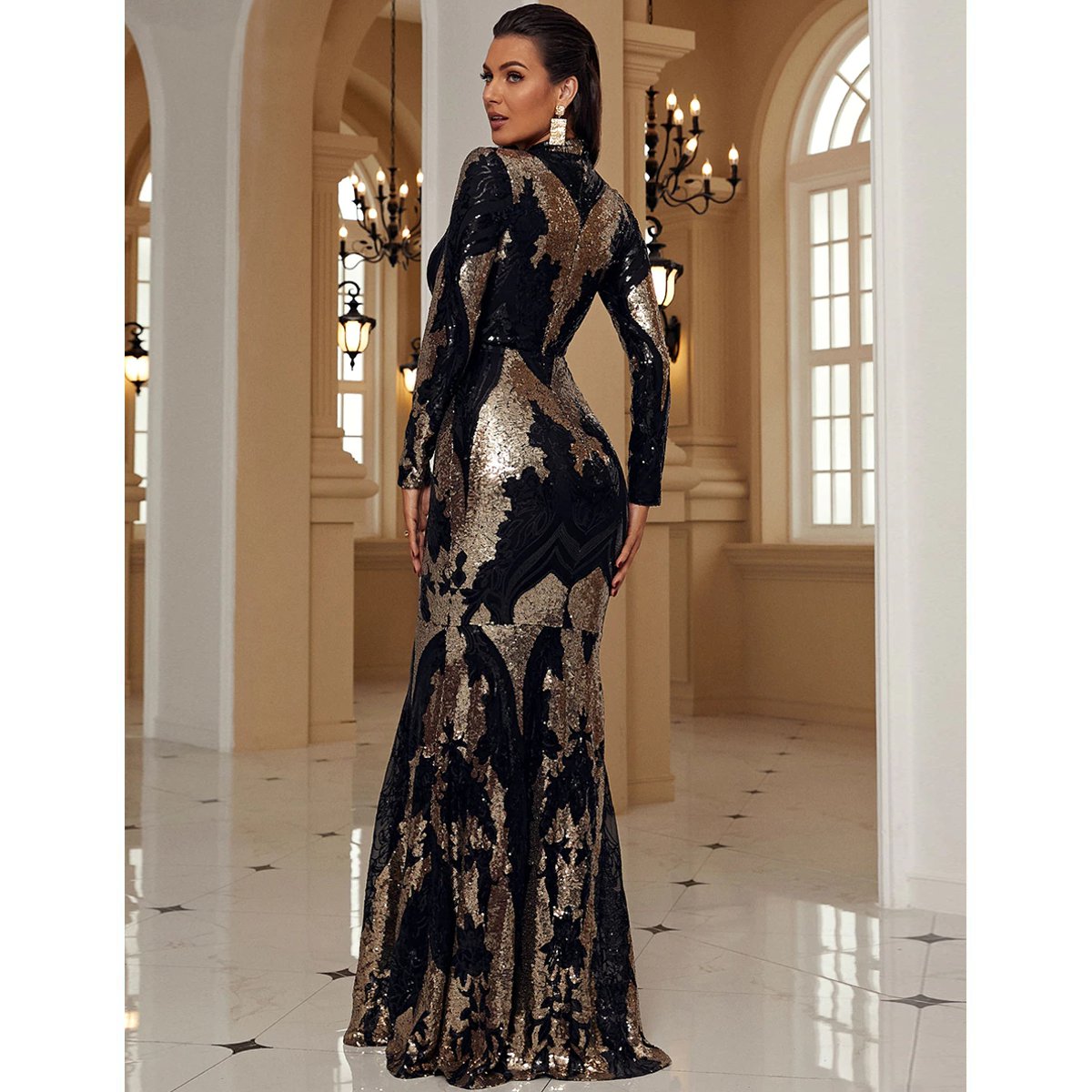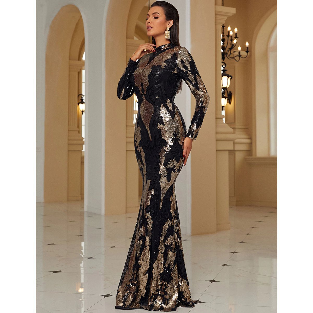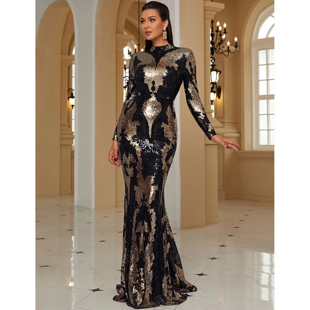 - Confeccionado con lentejuelas doradas y negras ultra brillantes y cuello redondo.