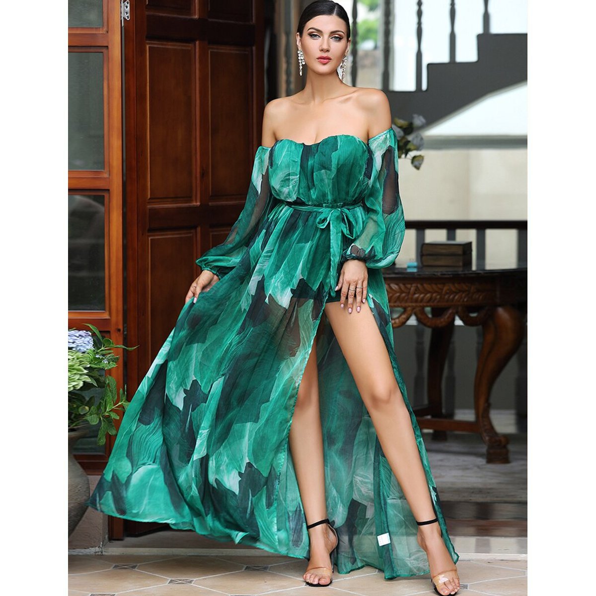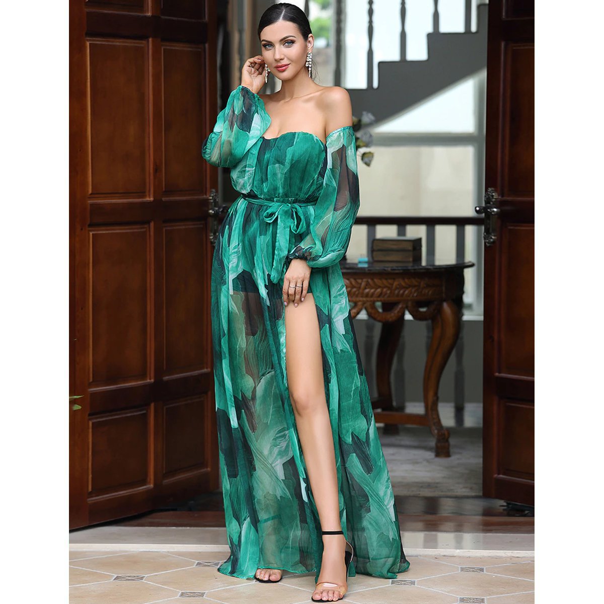 - Hermoso vestido de fiesta, con mangas y sin hombros.