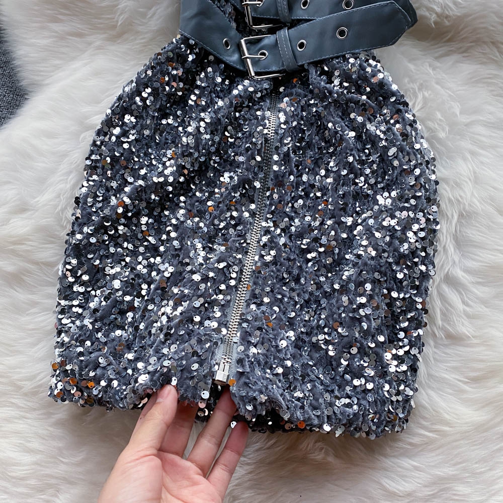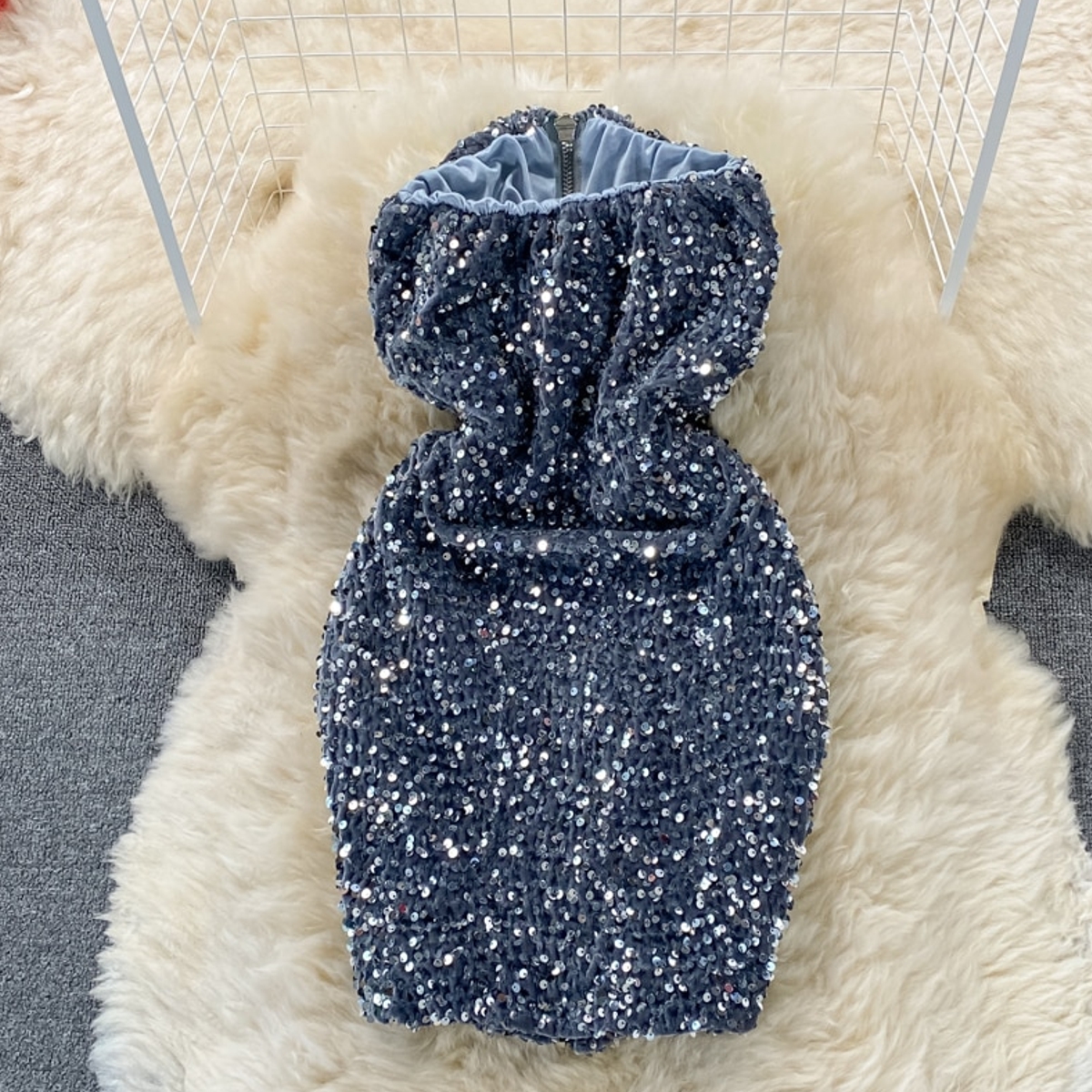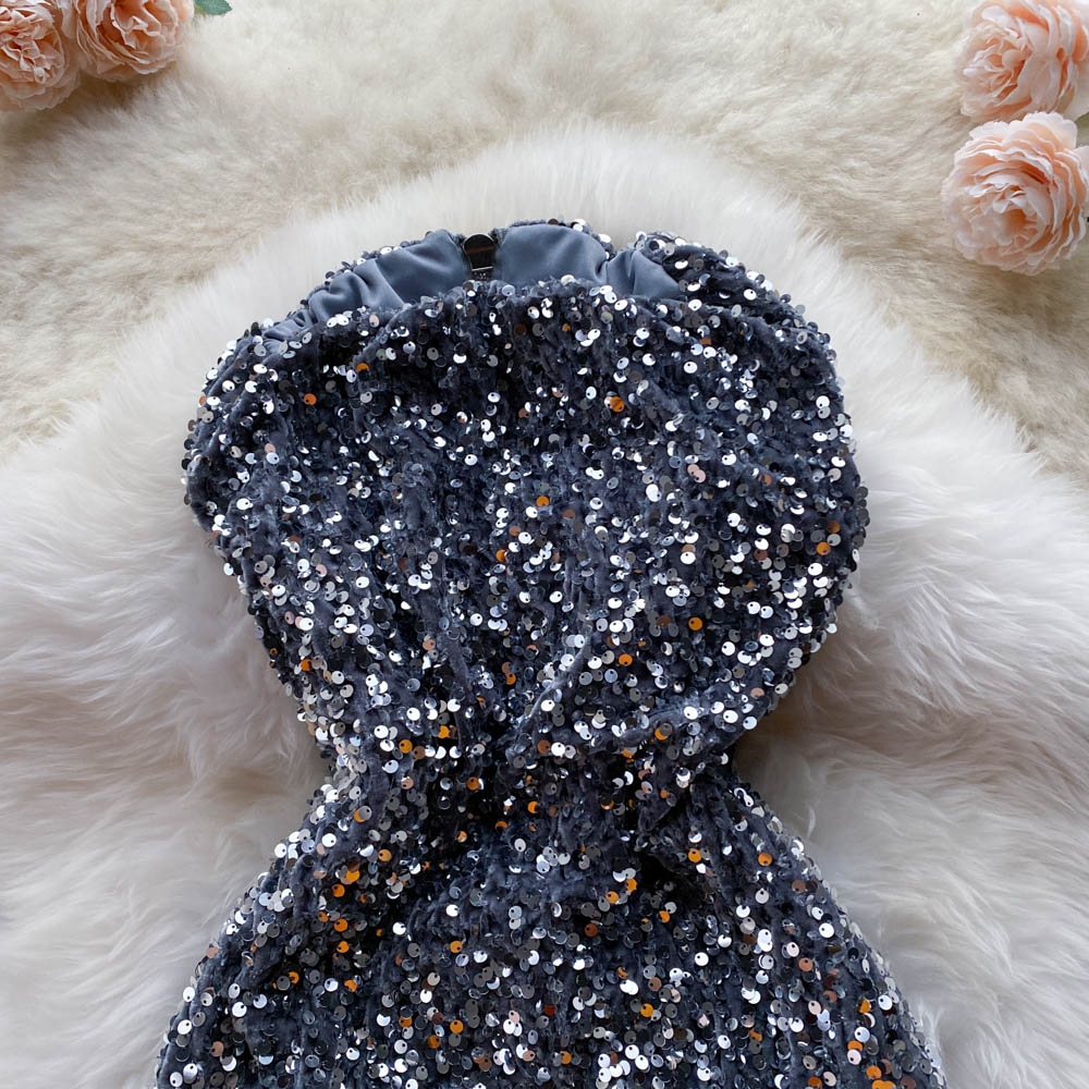 - Quedarás maravillada con este hermoso vestido con lentejuelas y sin tirantes.