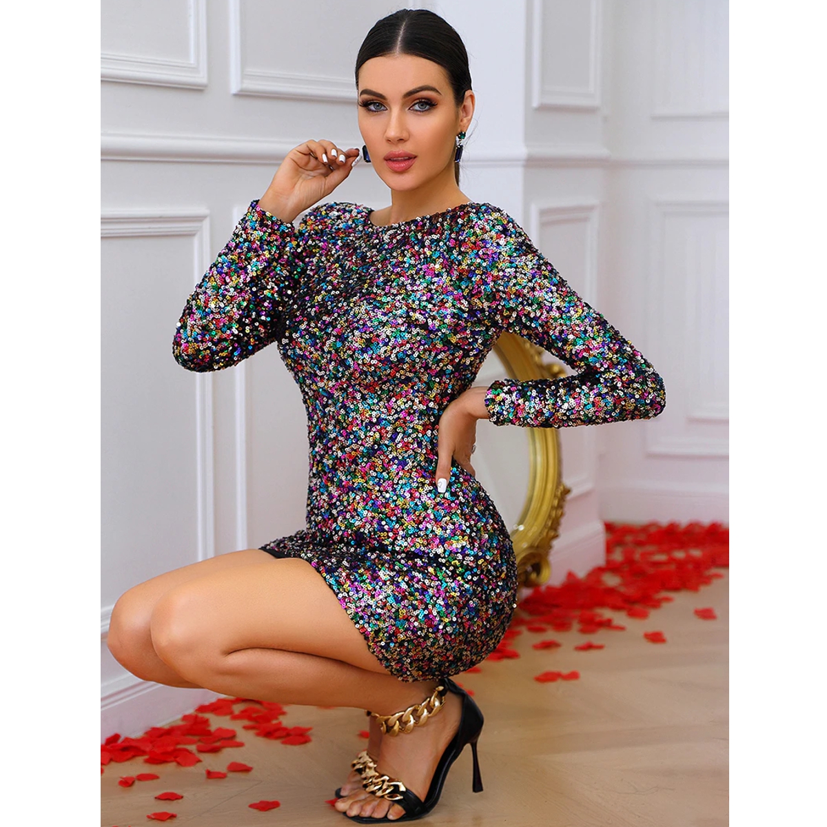 - Hermoso mini vestido brillante, hecho de lentejuelas multicolores.