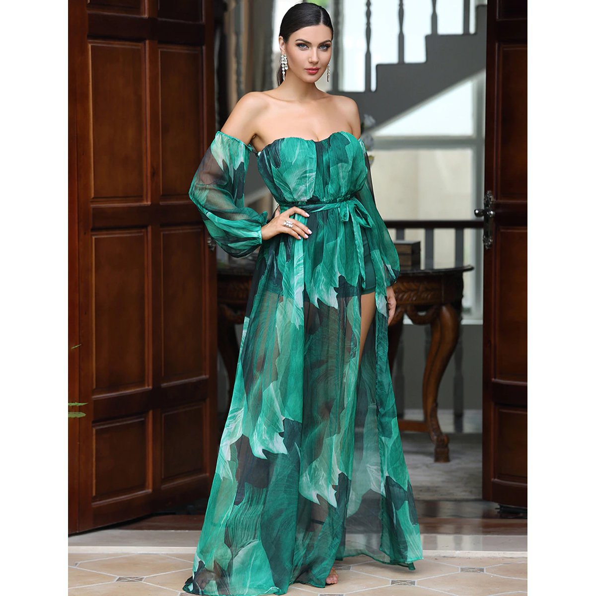 - Hermoso vestido de fiesta, con mangas y sin hombros.